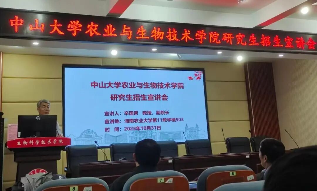 为搭建我校学子与国内顶尖高校间的学术交流桥梁,拓宽毕业生深造渠道,助力学子精准把握升学机遇与未来发展方向,2025年10月31日,中山大学农业与生物技术学院研究生招生宣讲会于我校第十一教学楼503教室成功举办。本次宣讲会特邀中山大学农业与生物技术学院副院长辛国荣教授主讲,吸引了众多有志于深造的同学积极参与。