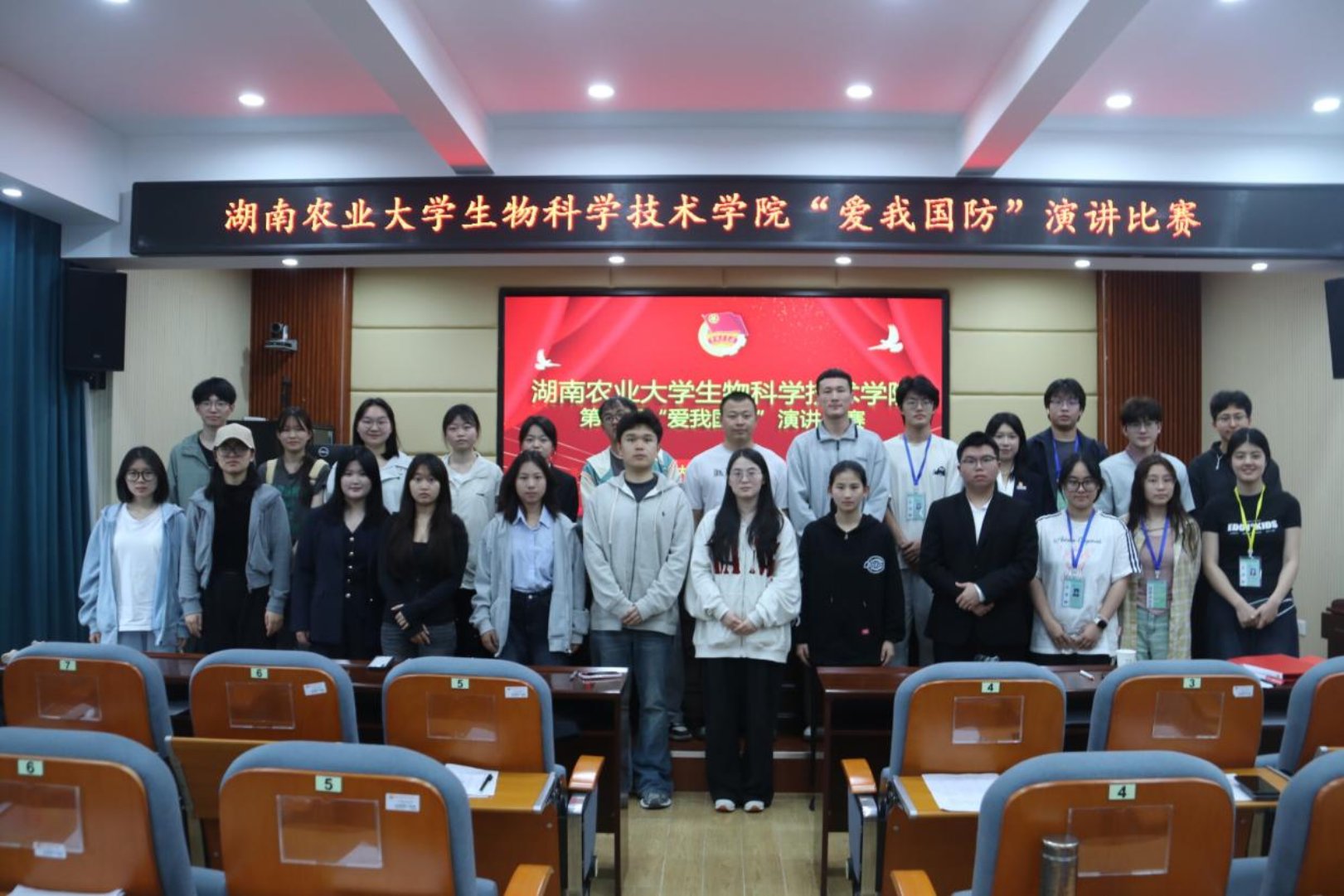 比赛现场,参赛选手依次登台,紧扣演讲主题,结合伟大长征精神,畅谈青年与国防建设的紧密联系,立志将爱国之情转化为勤学奋进、锤炼本领的实际行动,尽显湘农学子心系家国、矢志报国的青春风采。学校纠察队队员结合自身抗洪抢险亲身经历,用鲜活事例讲述守护人民安全的动人故事,让全体师生深刻领悟国防建设的重要意义与时代价值。